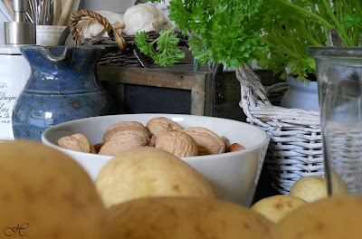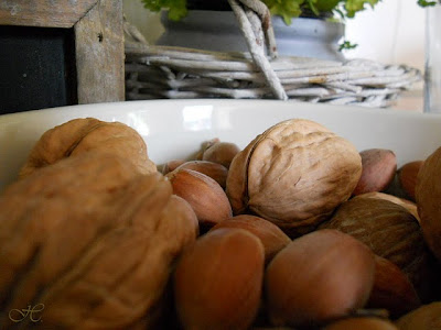 En op tafel al een glazen pot met dennenappeltjes, kaneelstokjes en eikeltjes.